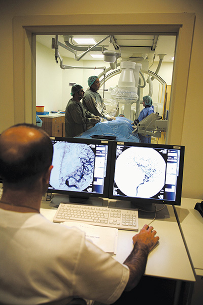 - Неврологічне лікування: Гострий інсульт можна лікувати ангіографічно шляхом видалення тромбу в судинах головного мозку, якщо діагноз поставлено протягом 6 годин. Одна з найбільш небезпечних для життя і виснажливих проблем, яка викликана церебральними аневризмами, внутрішньочерепний крововилив у мозок, може бути вирішена за допомогою інтервенційної нейроемболізаційної терапії.
