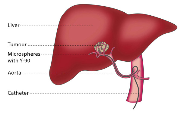 Радіоемболізація та хіміоемболізація схожі, оскільки починаються з введення катетера через пах до судин, що живлять пухлину в печінці. При хіміоемболізації мікрочастинки з хіміотерапевтичними препаратами доставляються до пухлини печінки ангіографічно. При радіоемболізації з цією ж метою використовують радіоактивні мікросфери (Ytrium-90), що дозволяє отримати високу дозу опромінення всередині пухлини, тоді як здорові тканини, розташовані поруч, отримують мінімальне опромінення.