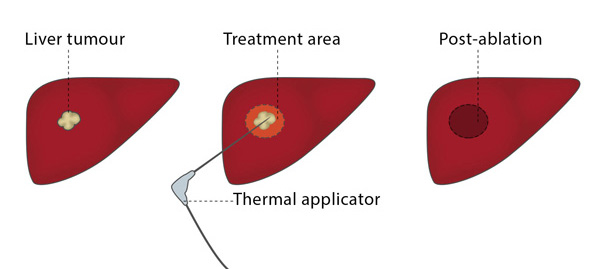 - Онкологічне лікування: Багато пухлин можна лікувати нагріванням, заморожуванням або хімічними абляційними методами. Іншим стандартним методом лікування, який здебільшого застосовується при первинних і метастатичних пухлинах печінки, є блокування судин пухлини за допомогою м’яких частинок (емболізація) або хіміотерапевтичних препаратів (хіміоемболізація) чи радіоактивних ізотопів (радіоемболізація).